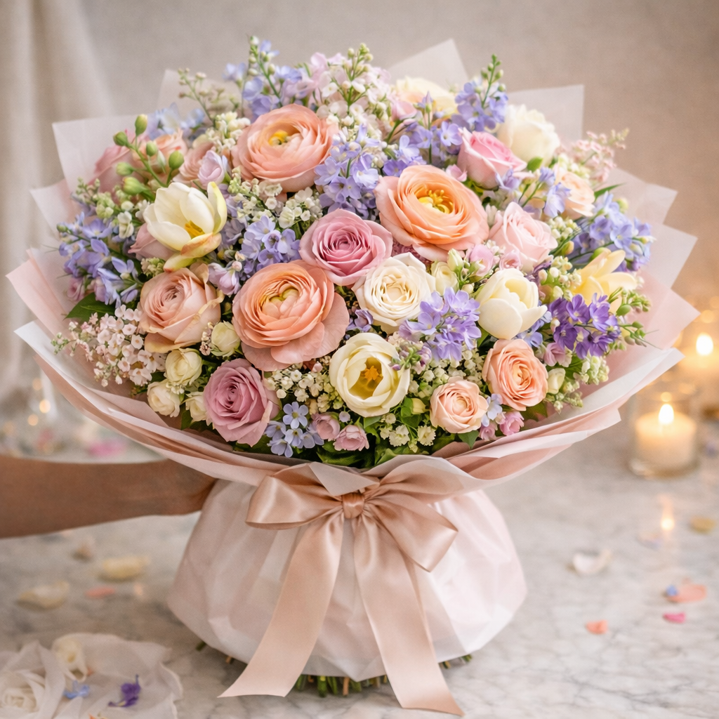 Our luxury spring bouquet features a curated selection of premium seasonal florals in soft pastel tones, artfully arranged to capture the freshness and romance of spring. Finished with elegant wrapping and silk ribbon.