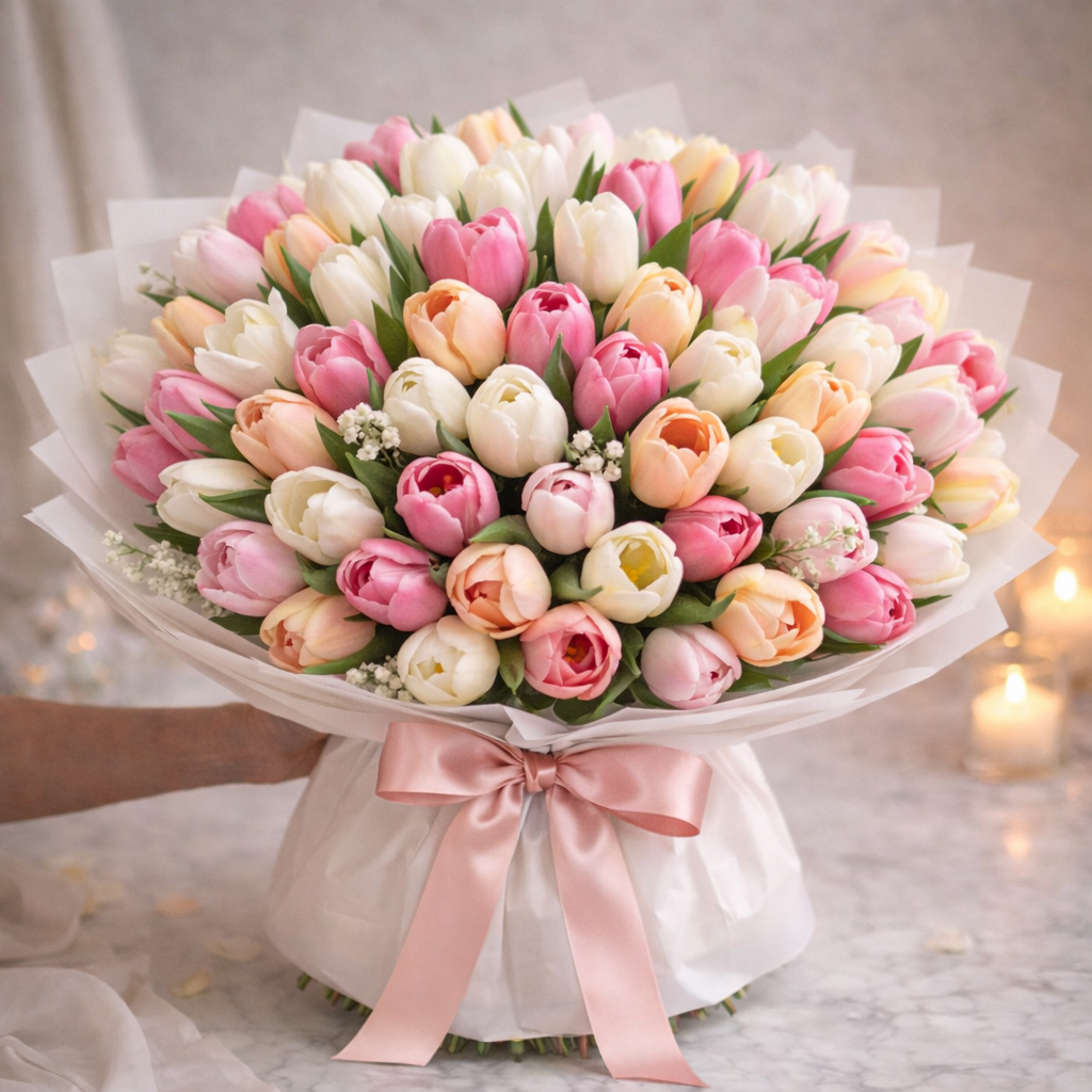 Our luxury tulip bouquet features an abundant arrangement of premium tulips, hand-tied to showcase their natural movement and elegance. Finished with refined wrapping and silk ribbon.